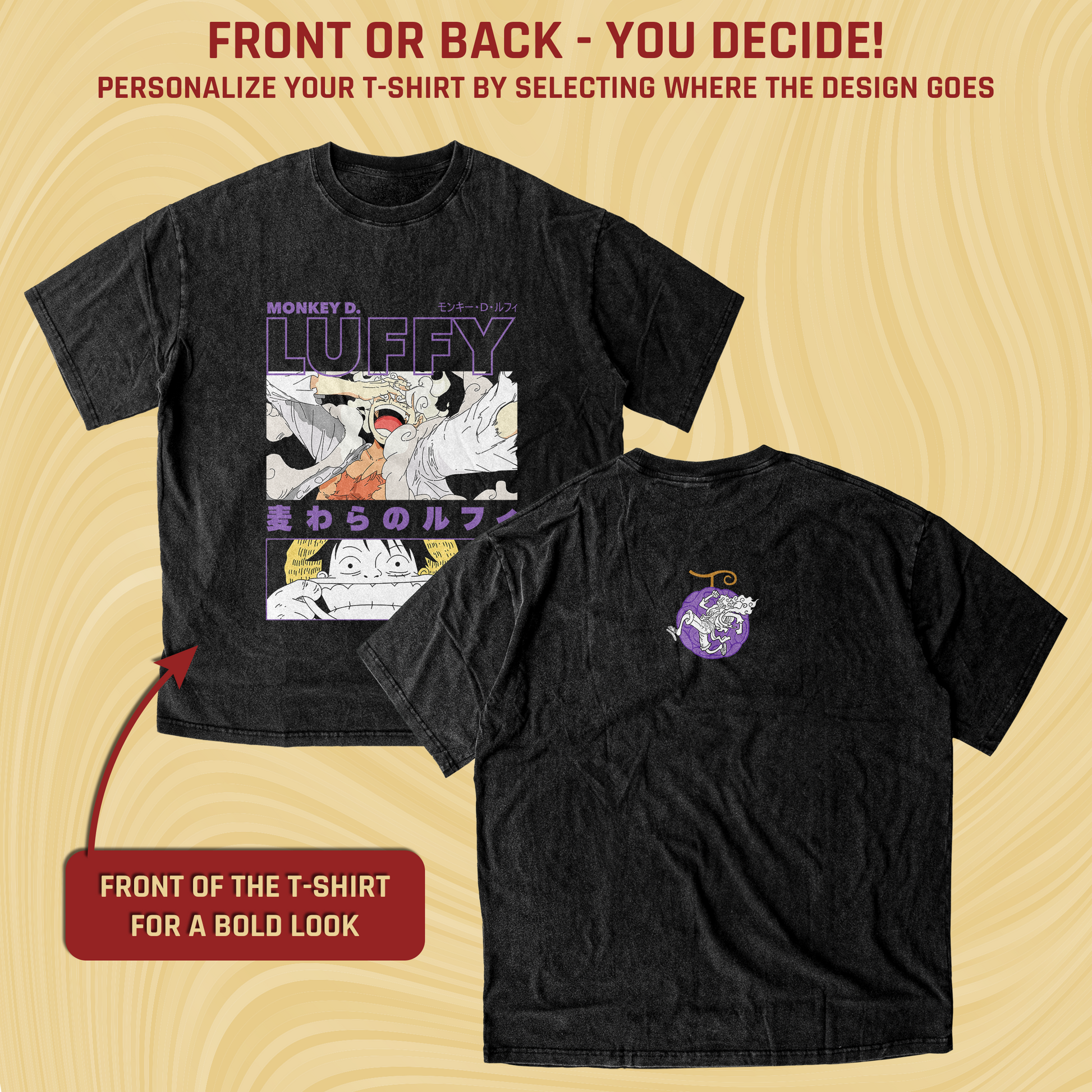 A two-panel manga composition showing Luffy in his Gear Five awakening—wild laughter, cloud-like hair, and pure freedom. The contrast between chaotic motion and playful expression captures his Joyboy spirit and the power born from liberation, not rage.